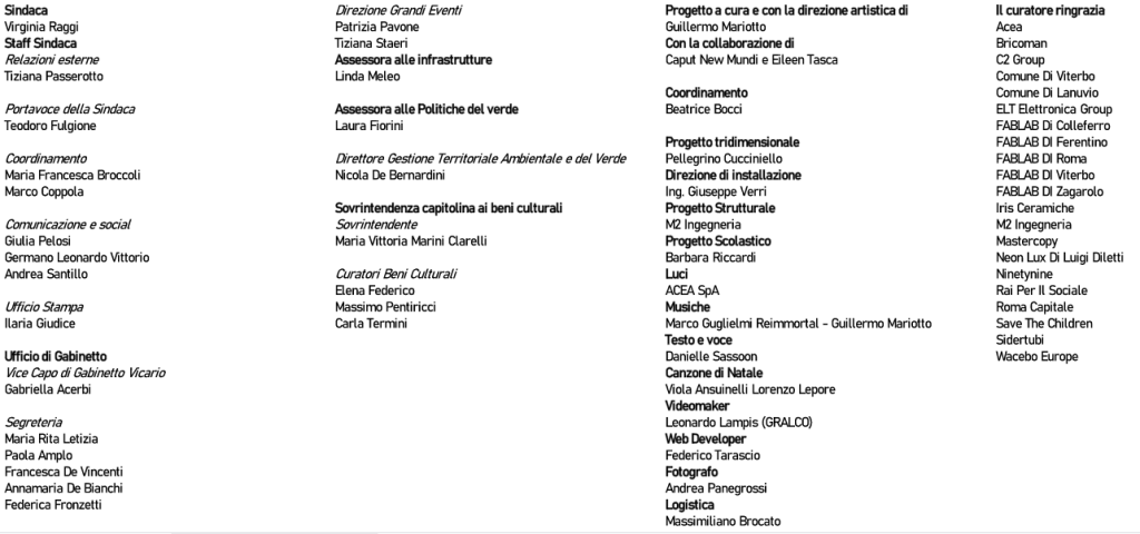 As part of the initiatives of Roma Capitale for the Christmas holidays in Rome, in association with Caput New Mundi Enterprise, promoted by the Municipality of Rome and with the patronage of RAI RadioTelevisione Italiana, the City of Viterbo and the City of Lanuvio.