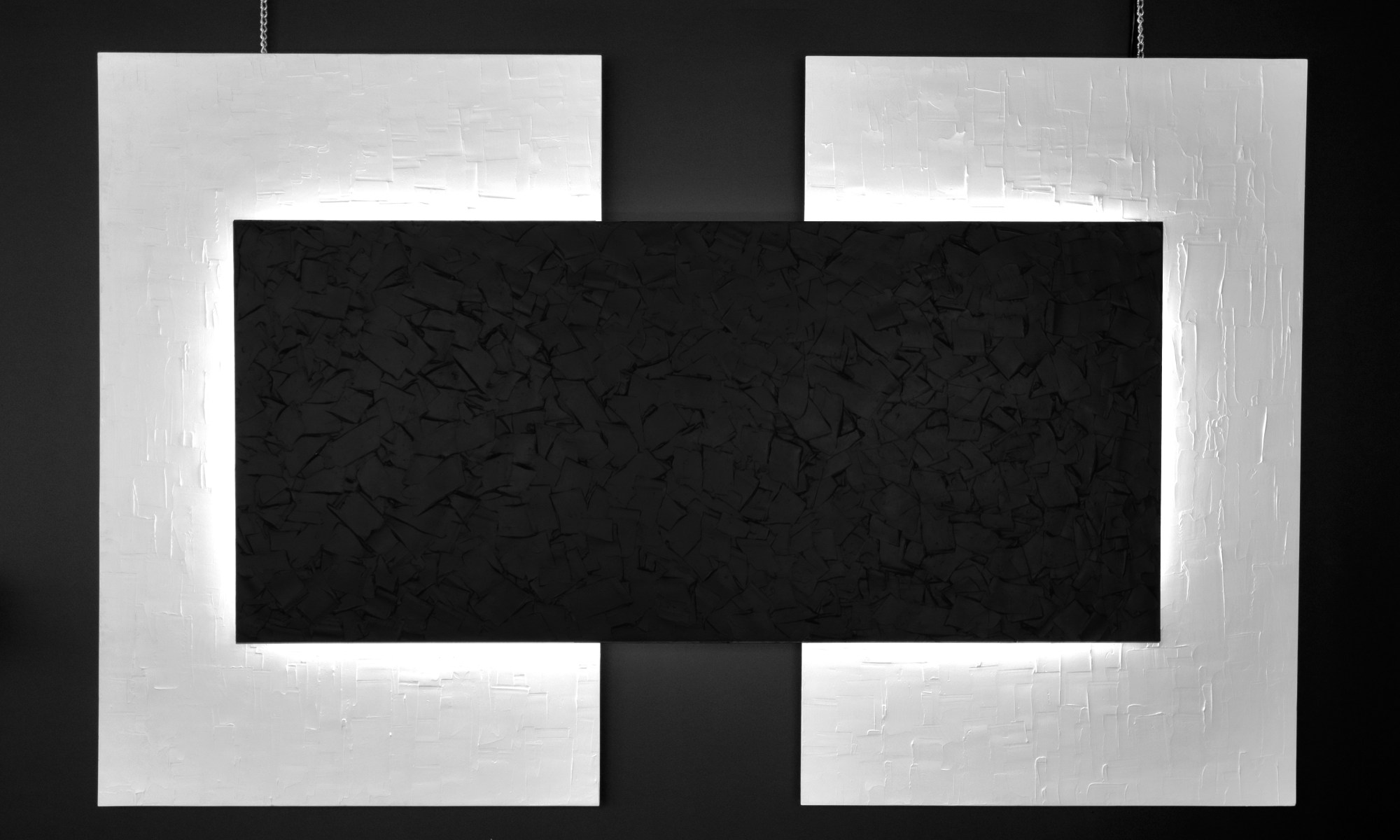 These three-dimensional works lie between sculpture and installation. The backlight system is specifically conceived to create a peculiar ‘suction’ effect, the optical illusion of a perceptive void at the center of the vision. Each Wall is made of wood and plaster and conceived as a room harmonizer and a furnishing element.